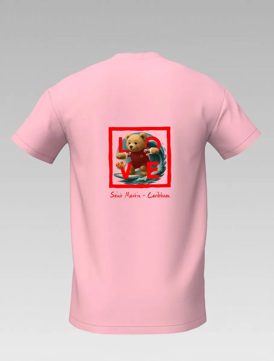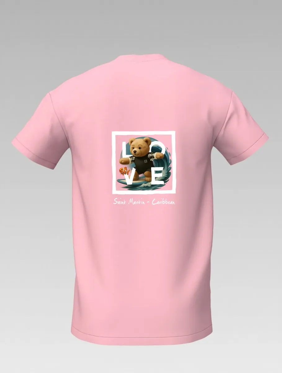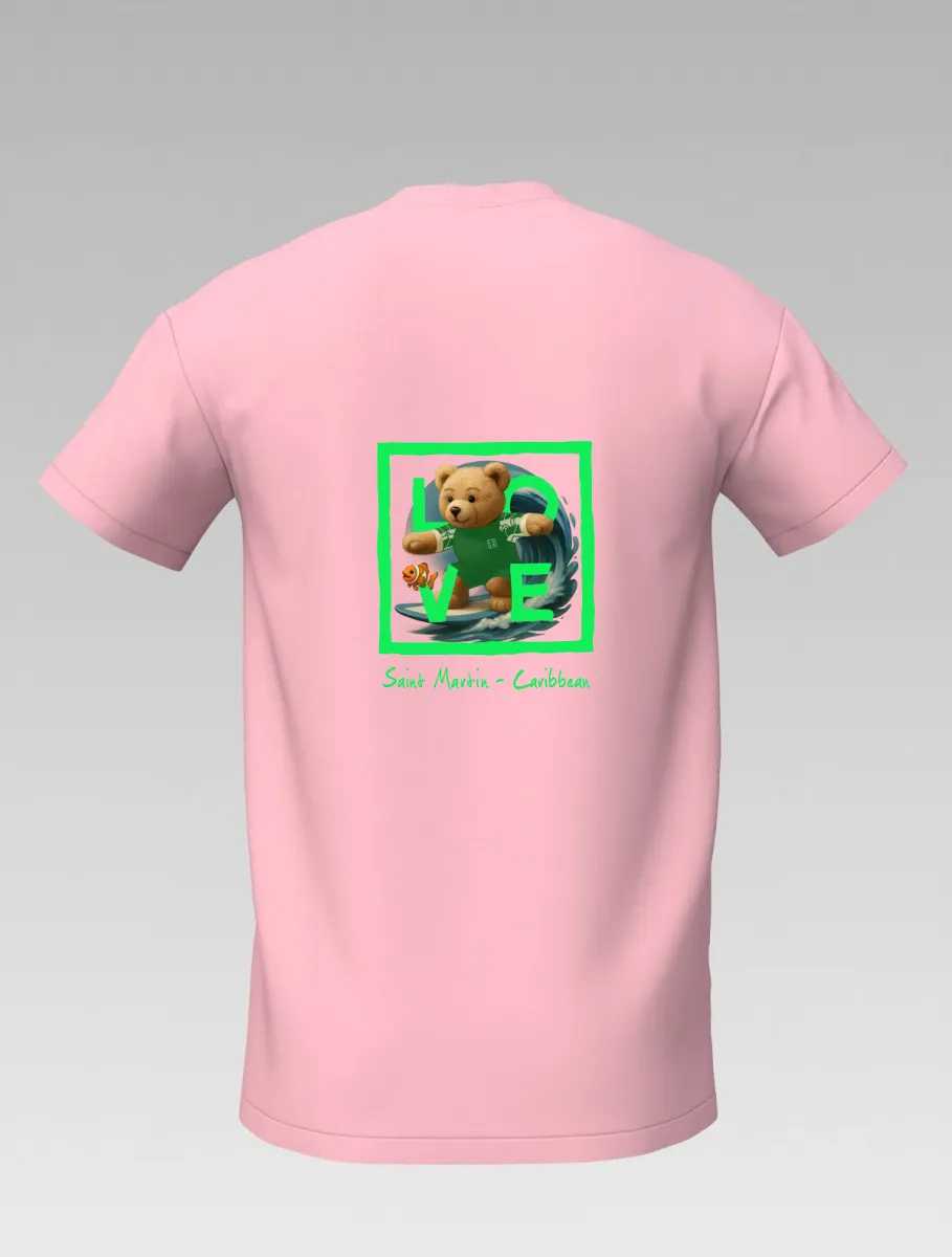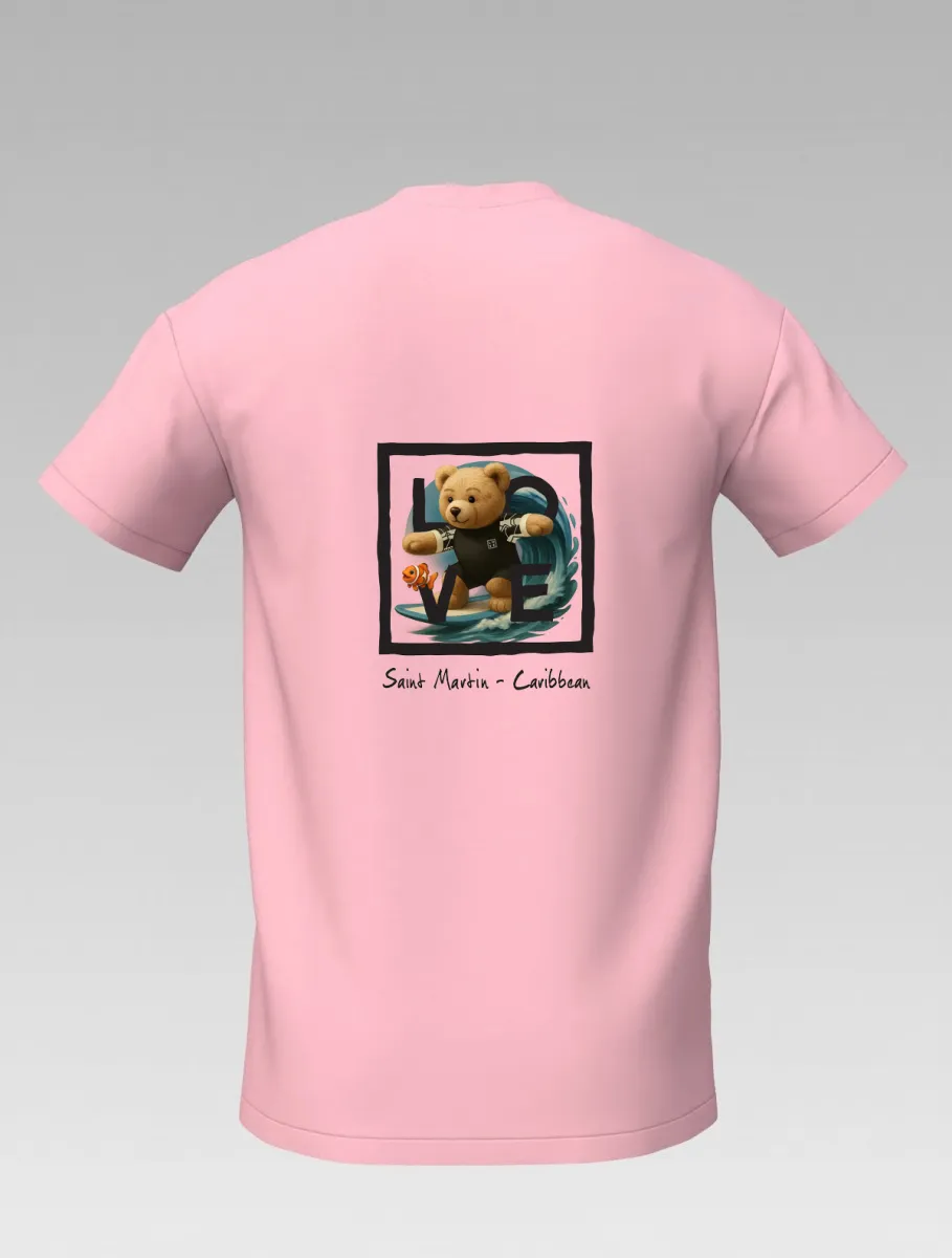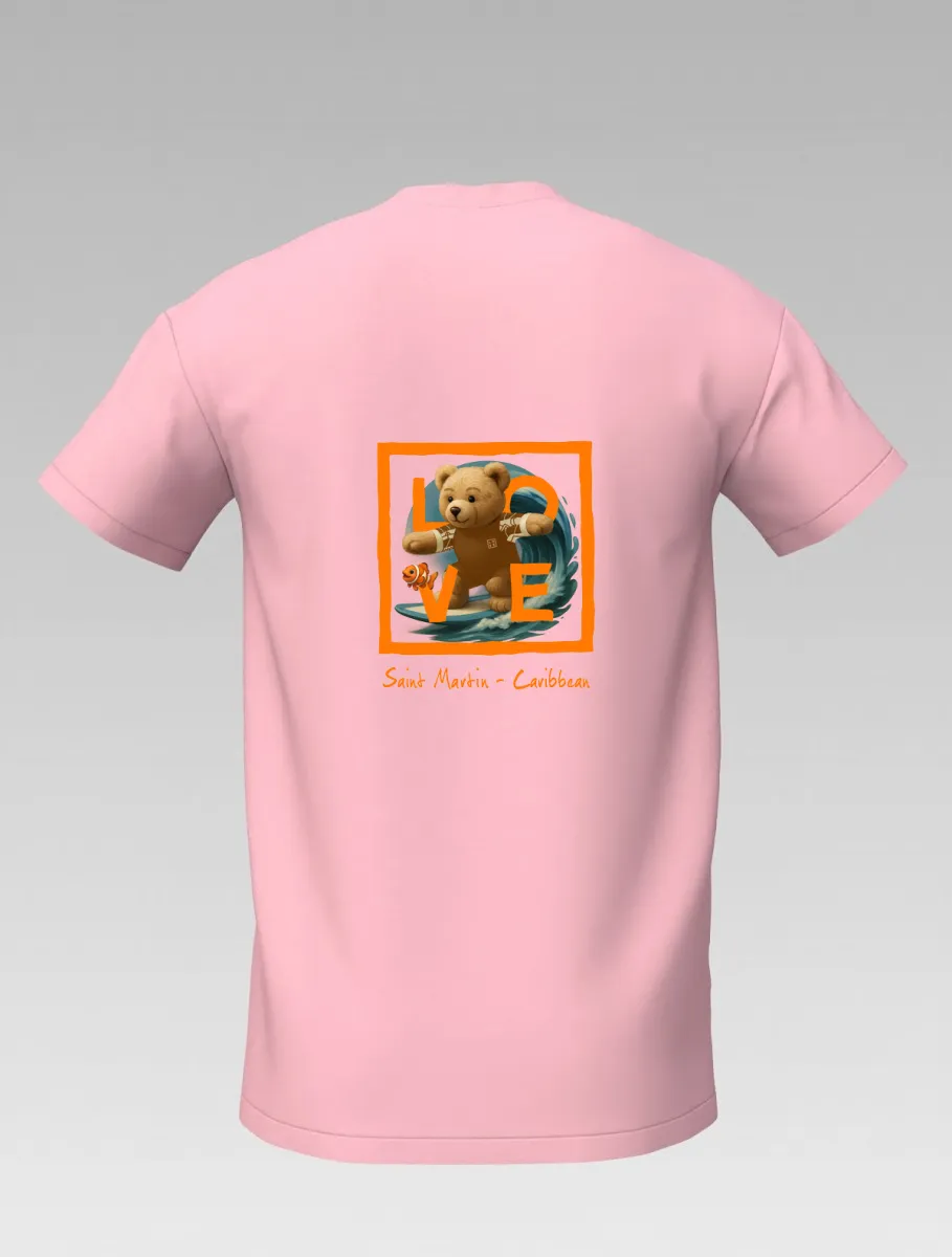 Kid’s T-shirt – cotton & spandex – Plain Signature Saint-Martin - Bear riding a surf board on the waves